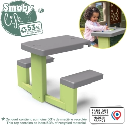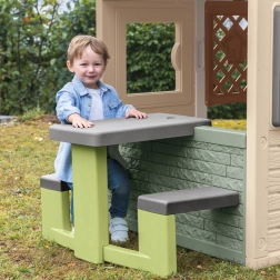 Het picknicktafeltje met bankjes is een ideale aanvulling voor kinderspeelhuisjes zoals de Neo Jura Lodge, My New House, Chef House en Evo Friends House. Het is ontworpen om kinderen een comfortabele plek te bieden om te spelen en te ontspannen.