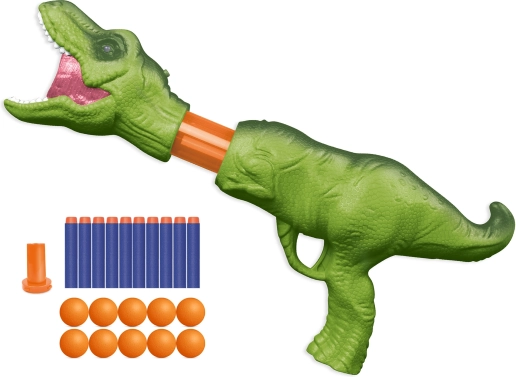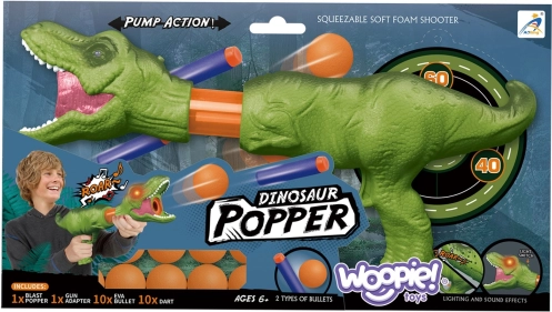 De dinosaurusblaster van WOOPIE maakt van iedere kindermissie een avontuur. Plaats een foam balletje of zet de adapter voor pijltjes erop, trek de kop van de “T-Rex” naar achteren en laat los – en het speelplezier kan beginnen. Dankzij het lange schietbereik en de eenvoudige bediening kunnen kinderen alleen of met vrienden een wedstrijdje doelen omver schieten houden.