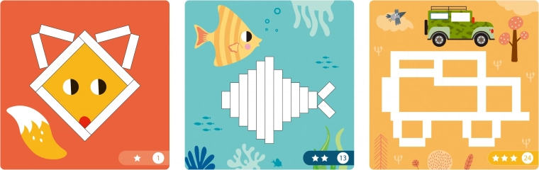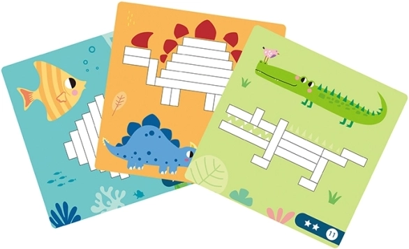 Kleurige kaarten met dieren en patronen leiden kinderen stap voor stap, maar laten ook ruimte voor vrij creëren.