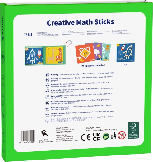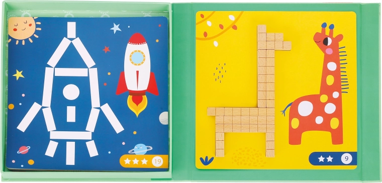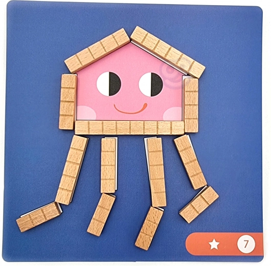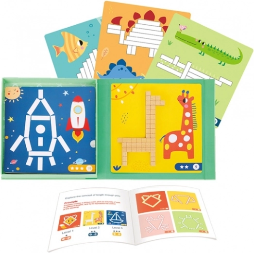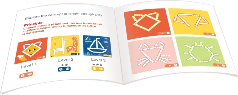De set bevat 12 dubbelzijdige kaarten met opdrachten van uiteenlopende moeilijkheid en 36 magnetische stokjes in verschillende lengtes. Kinderen kunnen volgens voorbeelden leggen of eigen ideeën creëren – plezier dat creativiteit en concentratie stimuleert en tegelijk vroege rekenvaardigheden ondersteunt.