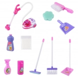 - trolley op wielen, stofzuiger, polystyreen bolletjes (imitatievuil), grote bezem, grote stoffer en blik, mop, kleine borstel, kleine stoffer en blik, spons, “ruitenreiniger”, “vloerenreiniger”, sprayfles (imitatie)