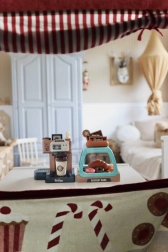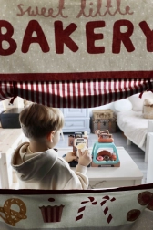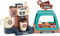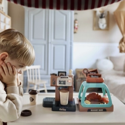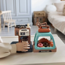 Dankzij de mogelijkheid van modulair gebruik (gekoppeld of gescheiden) past de set zich gemakkelijk aan elke ruimte en de fantasie van kinderen aan. De rijke accessoires met bekers, “koffie”, suiker, munten en bankbiljetten stimuleren communicatie, tellen en klanten bedienen tijdens het spel.