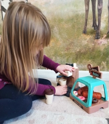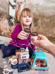 De WOOPIE kindercaféset biedt een authentieke koffie-ervaring – giet water in het reservoir, plaats de hendel, zet het bekertje eronder en de “koffie” is klaar. Tijdens het malen en zetten klinken realistische geluiden, brandt een rood lampje en na afloop gaat een groene indicator aan met een geluidssignaal. De vitrine met donuts, croissants en andere lekkernijen zorgt voor de sfeer van een kleine bakkerij.