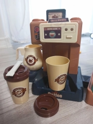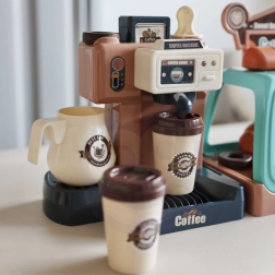 Giet water in het bovenste reservoir, plaats de hendel en kijk hoe de “koffie” in het bekertje stroomt. Begeleidende geluiden en indicatorlampjes maken van het spel een onvergetelijk ritueel.