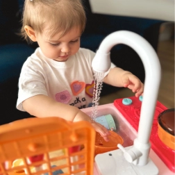 Met behulp van de ingebouwde pomp kan water vrij uit de kraan stromen wanneer kinderen het bakje vullen. Dit interactieve element geeft het spel een authentiek gevoel.
