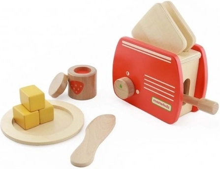 - Setinhoud: toaster met beweegbare hendel en knop, twee houten sneetjes ‘brood’.