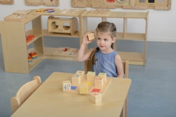 Een extra functie is de mogelijkheid om het lege blok met elk gewenst materiaal te vullen, bijvoorbeeld zand of steentjes, en te ontdekken welk geluid het bij het schudden maakt. Het speelgoed is ideaal voor Montessori-benaderingen.