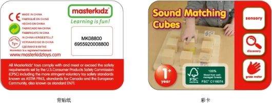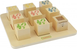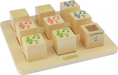 De set bevat een bord en acht houten blokken die bij het schudden verschillende geluiden maken. De taak van het kind is om de juiste paren op basis van het geluid te vinden.