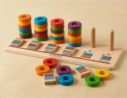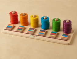 Ontdek een slimme houten speelgoedset die spel en leren combineert. De robuuste houten basis met pinnen en een set gekleurde ringen helpt kinderen kleuren herkennen, tellen leren en coördinatievaardigheden trainen. De ruimte vóór de pinnen is ideaal voor het plaatsen van sequentieblokken, wat nieuwe uitdagingen biedt en de concentratietijd verlengt.