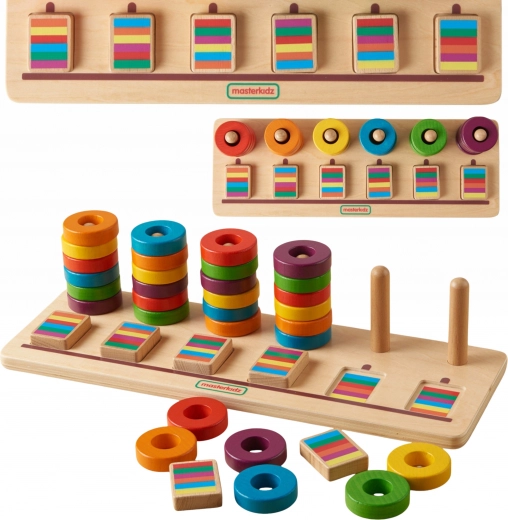 De houten educatieve sorter van MASTERKIDZ is een ideale hulp voor kinderen vanaf 2 jaar. Ondersteunt de ontwikkeling van de fijne motoriek, het leren van kleuren, sorteren en rangschikken op volgorde. Dankzij de 30 gekleurde ringen in de set kunnen kinderen tellen, reeksen leggen en logisch denken versterken op een speelse manier.