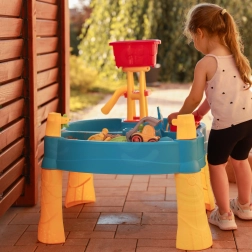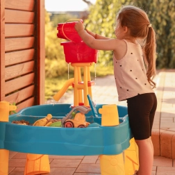 Zoek je een veelzijdige speeltafel voor in de tuin, op het terras of in de kinderkamer? Deze 2-in-1 water- en zandtafel heeft gescheiden compartimenten voor water en zand, zodat kinderen kunnen scheppen, strooien en gieten zoals op het strand. De watermolen gaat draaien tijdens het gieten en stimuleert het begrip van oorzaak en gevolg.