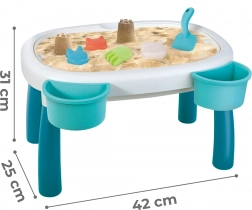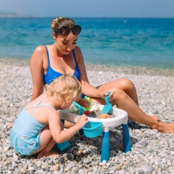 De set bevat 7 praktische accessoires – een gieter, schep, 4 vormpjes (octopus, kat, panda, konijntje) en twee reservoirs voor in de tafel. Zo kunnen kinderen zandkastelen bouwen, water gieten en hun creativiteit en handvaardigheid ontwikkelen.