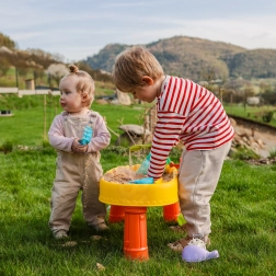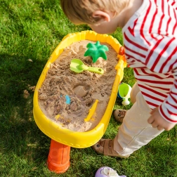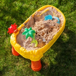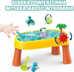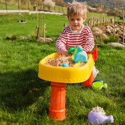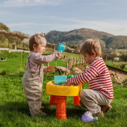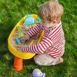 In de set zitten 8 praktische accessoires – vormpjes, een visje, een gieter, een beker met oor, een hark en een schep – die creativiteit, fijne motoriek en samenwerking stimuleren. De tafel is licht, eenvoudig te monteren en te reinigen, en dus perfect voor dagelijks spelen binnen en buiten.