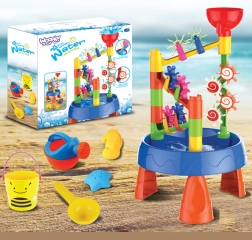 De tafel bevat interactieve molens die draaien wanneer water in de trechter wordt gegoten.<>