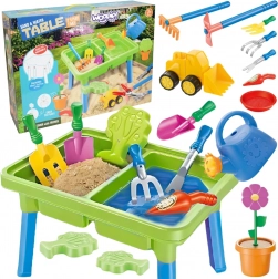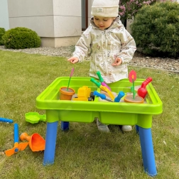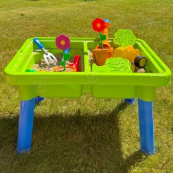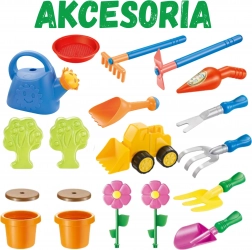 De rijke uitrusting van 13 accessoires (gieter, schepjes, harken, vormpjes, klein kiepautootje, bloempot met bloemetje en meer) prikkelt de verbeelding, ontwikkelt de fijne motoriek en ondersteunt zowel zelfstandig als samen spelen. Ideaal voor in de tuin, op het terras, op het strand en in de kinderkamer.