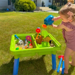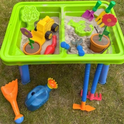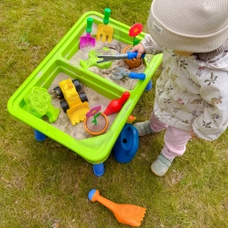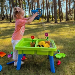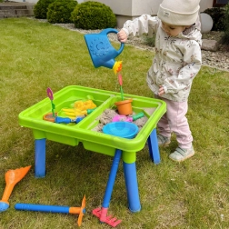 Gescheiden compartimenten maken gelijktijdig water- en zandspel mogelijk – kinderen kunnen gieten, scheppen en vormen zonder de materialen te mengen.