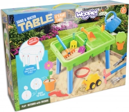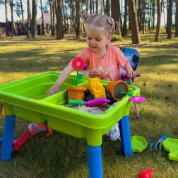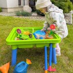 Ontdek de veelzijdige 2-in-1 WOOPIE speeltafel, die waterpret en zandscheppen combineert in één compacte set. Twee afzonderlijke vakken laten je de ene met water en de andere met zand vullen, zodat kinderen tegelijk kunnen scheppen, gieten, zeven en vormen.