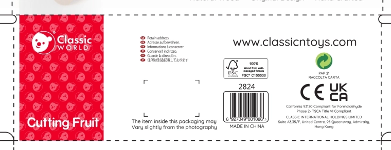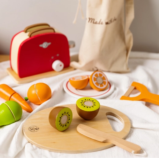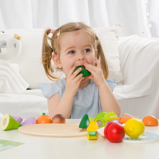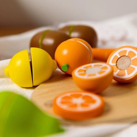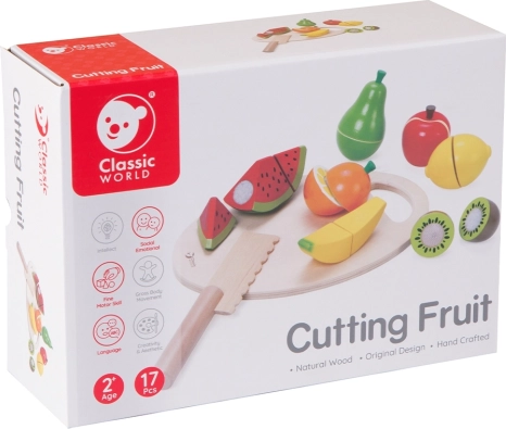 De houten fruit-snijdset van Classic World is een uitstekende speelset voor kleine koks. Bevat 17 onderdelen die kinderen leren fruit te snijden op een speciale houten snijplank. De afzonderlijke fruitdelen zijn verbonden met klittenband, waardoor kinderen tijdens het snijden tegendruk zoals bij echt snijden ervaren. Na het snijden kan het fruit gemakkelijk weer in elkaar worden gezet en kan het spel opnieuw beginnen.