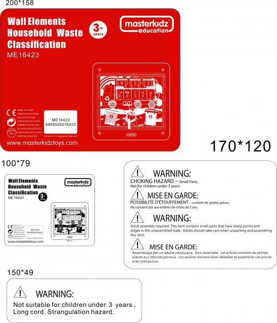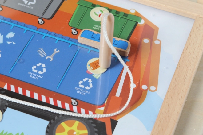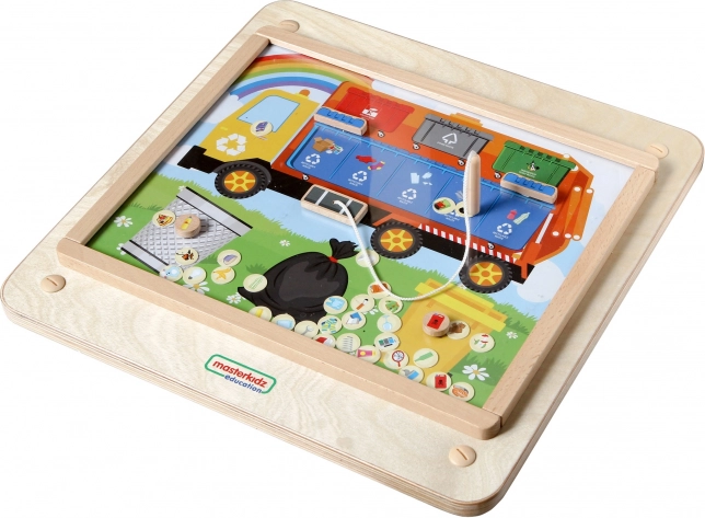 Interactief houten bord van Masterkidz leert kinderen op speelse wijze afval scheiden, geïnspireerd door de Montessori-methode. Met behulp van een magnetische/bedienings-‘tool’ verplaatst het kind afvalpictogrammen naar de juiste gekleurde containers op een bord met een vuilniswagen. Het stimuleert fijne motoriek, oog-handcoördinatie, concentratie en milieubewustzijn. Te gebruiken aan de muur in een frame of los op tafel of vloer.