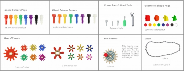 Educatieve tafel, 4 bouwplaten, 563 bouwstenen, 128 gekleurde pinnen, 128 gekleurde schroeven, 64 geometrische pinnen, 2 sets van 6 gereedschappen (sleutel, schroevendraaier met verwisselbare bits), 18 tandwielen, 1 houder voor tandwiel, ketting
