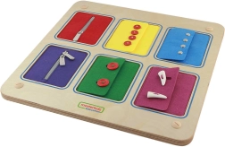 Dit hoogwaardige houten leermiddel biedt kinderen een veilige omgeving om echte sluitmechanismen te oefenen. Elk van de 6 horizontale zakken vertegenwoordigt een ander type sluiting dat je kent van jassen, hoodies of overhemden, zodat kinderen vaardigheden leren die ze elke dag gebruiken.