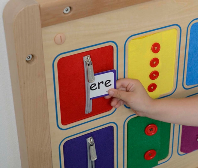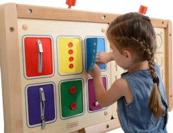 Het bord is ideaal voor kleuterscholen, speelhoeken en thuis. Dankzij de robuuste houten constructie en de rijke kleuren en texturen nodigt het uit tot ontdekken, traint het geduld en versterkt het zelfredzaamheid.