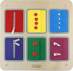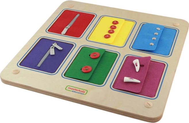 Stimuleer de handigheid van kinderen met het houten Montessori-bord van MASTERKIDZ. Zes gekleurde textielen zakken bootsen het sluiten van kleding na en leren kinderen praktische vaardigheden: ritsen, knopen, drukkers en een dubbele rits. De duurzame houten uitvoering en zinvolle spelervaring ondersteunen de fijne motoriek, oog-handcoördinatie en zelfstandigheid.
