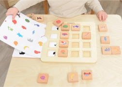 Dit Montessori leerspel combineert een houten basis met inzetbare vierkante stukjes en themakaarten. Het kind kiest het juiste stukje op basis van de afbeelding, het gekleurde silhouet of de zwarte schaduw en traint zo de visuele geheugen, het waarnemen van vormen en kleuren en de oog-handcoördinatie. De stevige houten uitvoering voelt prettig aan en is bestand tegen dagelijks spelen.