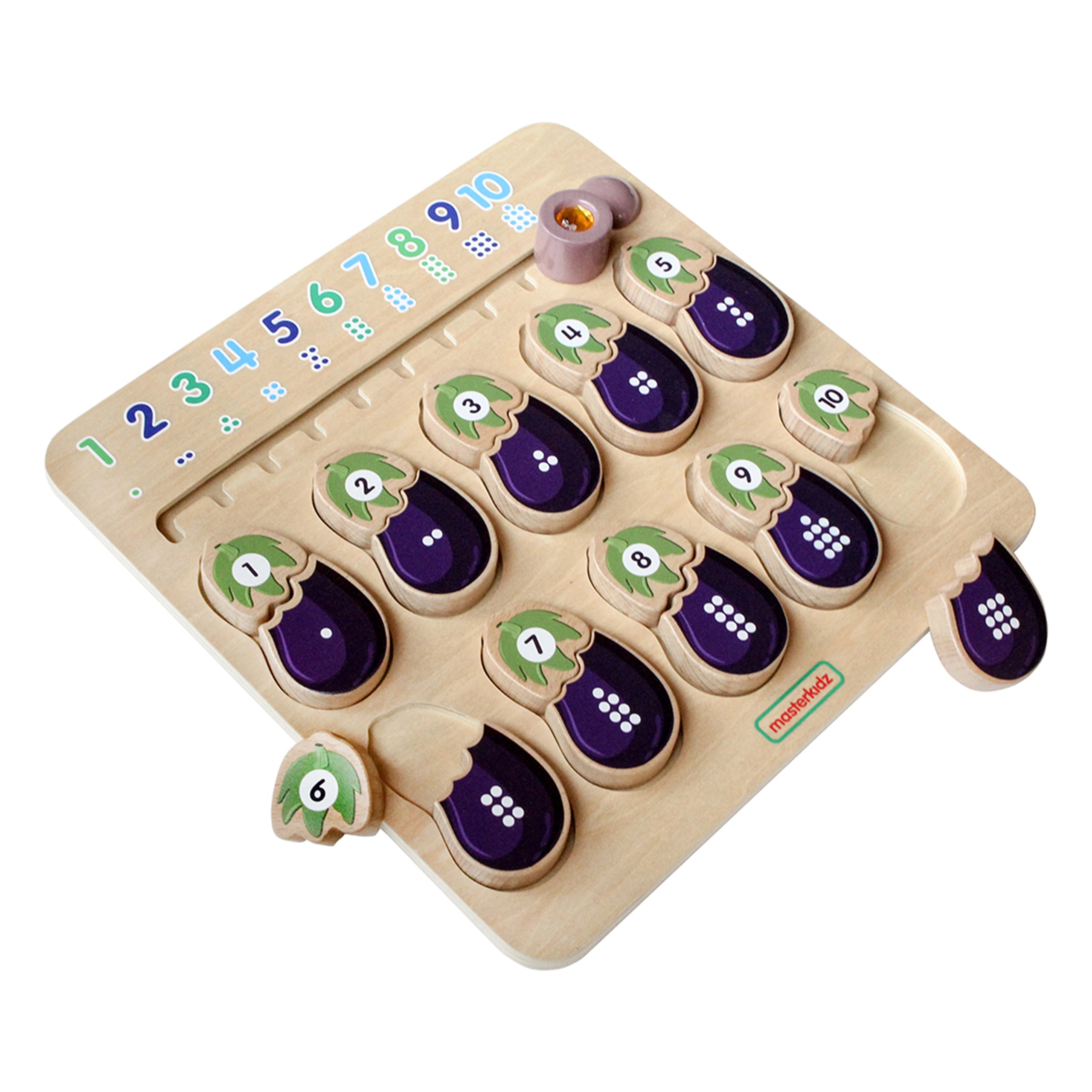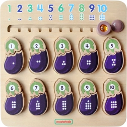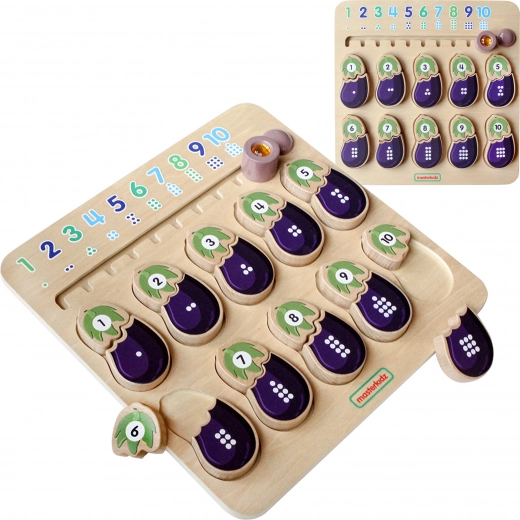 Het houten leertablet van het merk MASTERKIDZ is ontworpen om de zintuigen van kinderen te ontwikkelen. Deze tafel helpt kinderen kennis te maken met cijfers en kleuren. Kinderen moeten de juiste delen van de aubergine met elkaar verbinden – één deel stelt het cijfer voor en het andere het overeenkomende aantal stippen. Bovenaan zit een schuif met cijfers en stippen in de juiste volgorde.