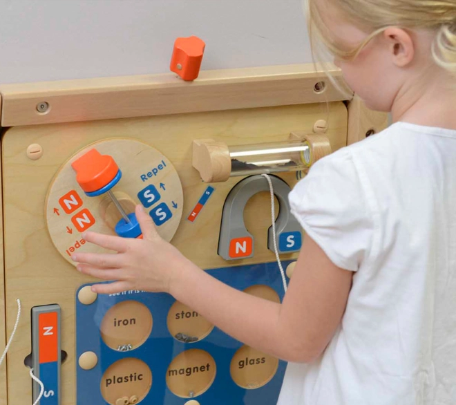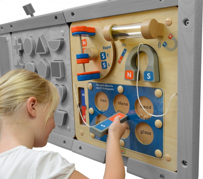 Dit magnetische wandpaneel combineert spel en natuurkunde: kinderen kunnen testen wat een magneet aantrekt en wat niet, de oriëntatie van polen volgen en ontdekken waarom sommige voorwerpen elkaar afstoten. De transparante buis met ijzervijlsel toont prachtig de magnetische krachtlijnen en het “zwevende” element met tegenovergestelde magneten trekt de aandacht en prikkelt de nieuwsgierigheid.