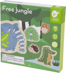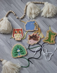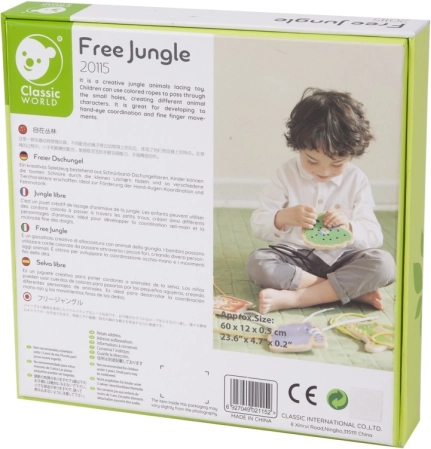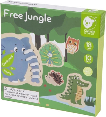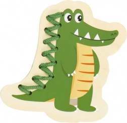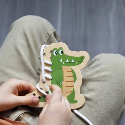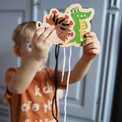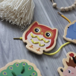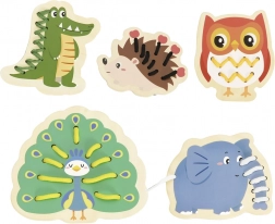 Deze houten rijgset bevat vijf vrolijke diertjes – een olifant, egel, krokodil, pauw en uil – en kleurrijke veters om ze door te rijgen. Kinderen koppelen eerst onderdelen zoals hoofd, poten, oren of staart aan de basis van het diertje en verbinden ze daarna met het koord. Een eenvoudige activiteit die veel plezier brengt en tegelijk gericht vaardigheden versterkt die belangrijk zijn voor peuters en kleuters.