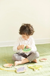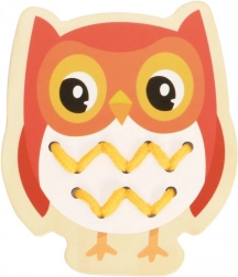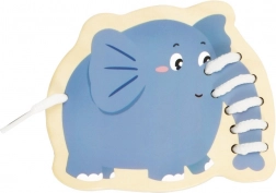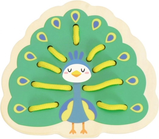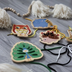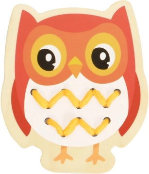 Voorgeboorde gaatjes en kleurrijke veters begeleiden kinderen stap voor stap naar een precieze greep en het oefenen van geduld – een ideale activiteit voor de peuter- en kleuterleeftijd.