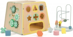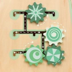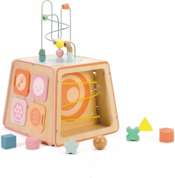Het kralenlabyrint, de tandwielen, schuivers en de vormensorteerder houden de aandacht vast en stimuleren concentratie en logisch denken.