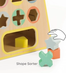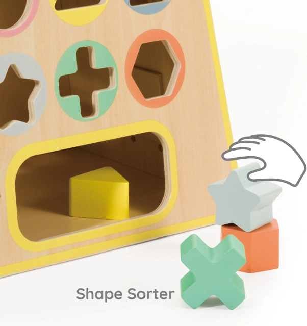 Dankzij de gevarieerde activiteiten – van de vormensorteerder en knikkerbaan tot draaibare tandwielen, schuivers en het kralenlabyrint – oefenen kinderen logisch denken, geduld en concentratie. Geheime deurtjes en een spiegeltje stimuleren nieuwsgierigheid en kiekeboespel.