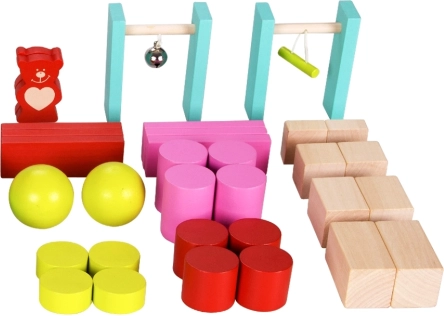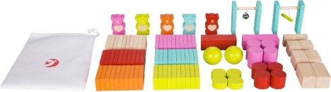 - Rechthoekige stenen, berenfiguren, ballen, cilinders, blokjes, balken, poort met belletje, poort met dwarslat