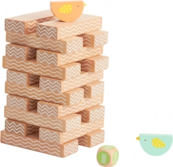 De set bevat een dobbelsteen met motieven die toeval en competitie aan het spel toevoegen – wie bouwt de hoogste toren zonder dat hij omvalt?