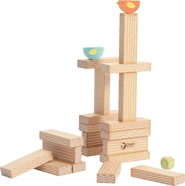 Ontdek het leuke houten spel van Classic World, waarin kinderen een toren bouwen en in balans houden met blokken en schattige vogeltjes. De set bevat 20 blokken, 2 vogeltjes en een dobbelsteen van... Meer tonen