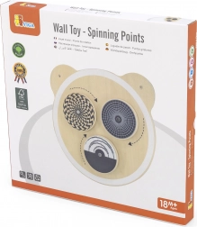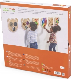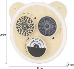 Het houten wandbord met berenmotief is ideaal voor de ontwikkeling van logisch denken en verbeeldingskracht bij kinderen. Het bevat drie ronde elementen die door rotatie optische illusies creëren en is beschilderd met niet-giftige verven in levendige kleuren. Dit speelgoed bezorgt elk kind plezier en past zowel thuis als in onderwijsinstellingen.