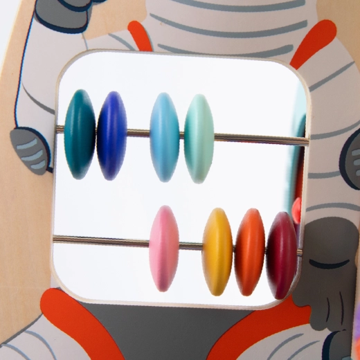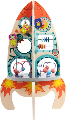 De raket bevat diverse interactieve elementen zoals doolhoven, kleurrijke kralen, een klok om de tijd te leren en een spiegel. Al deze elementen zijn ontworpen om de fijne motoriek en creativiteit te stimuleren.