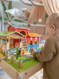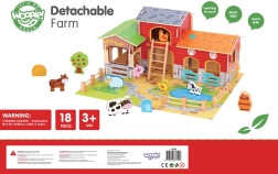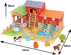 Bouw thuis je eigen boerderij! De houten mega boerderij WOOPIE GREEN neemt kinderen mee naar de wereld van de natuur, waar ze leren voor dieren te zorgen en het dagelijks leven op het platteland te ontdekken. Realistische gebouwen (stal, schuur en kippenhok), een vijver en gedetailleerde figuren stimuleren creatief verhalen vertellen en rollenspel.
