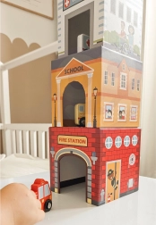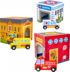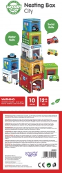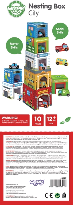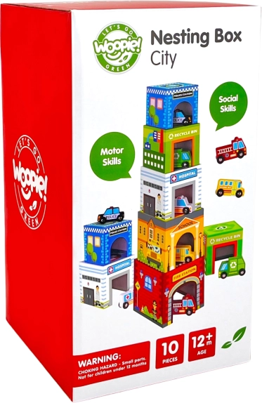 De WOOPIE GREEN inlegstad is een creatief alternatief voor klassieke bouwsets. Vijf geïllustreerde kartonnen blokken stellen bekende stadsgebouwen voor (bijv. brandweer, school, ziekenhuis, politie) en zijn genummerd van 1 tot 5 voor eenvoudig leren van tellen en groottes. Speciale openingen in de blokken maken het mogelijk om voertuigen in te leggen en op te bergen, zodat kinderen hun eigen verhalen en scènes uit het stadsleven kunnen creëren.