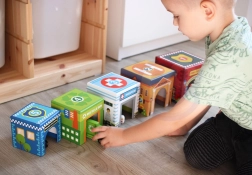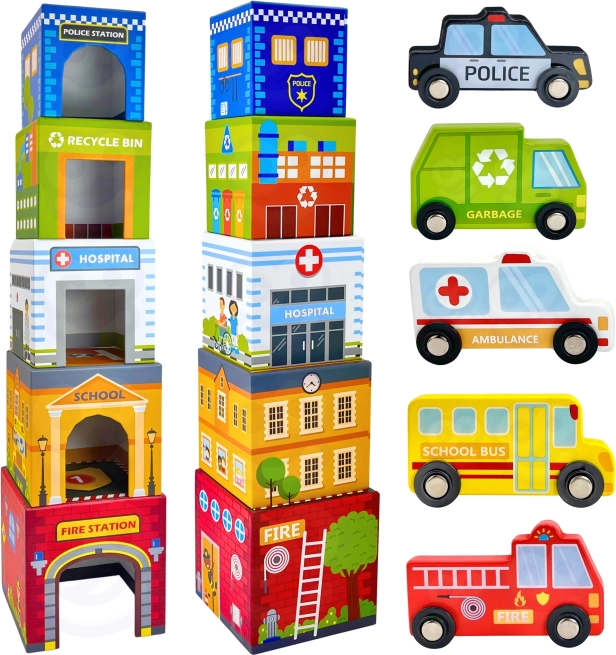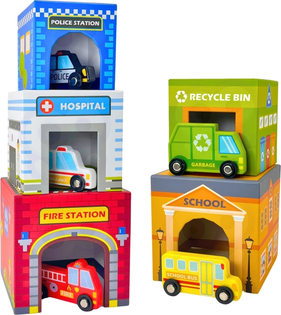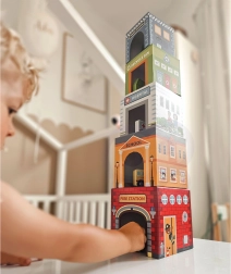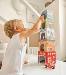Vijf genummerde blokken met openingen maken het mogelijk om torens te bouwen, voertuigen binnenin te plaatsen en al spelend de stad te ontdekken – ideaal voor de ontwikkeling van de fantasie.