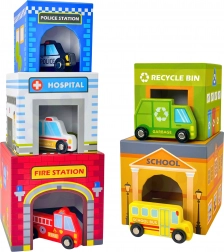 De set bevat vijf schattige houten autootjes op stille rubberen wielen (bijv. brandweerauto, ambulance, politieauto, bus, vuilniswagen). Het spel ondersteunt creativiteit en verbeeldingskracht, visuele waarneming en oog-handcoördinatie. Materialen en verven zijn veilig en niet-giftig, ideaal voor kleine ontdekkers vanaf 12 maanden.