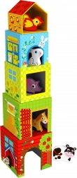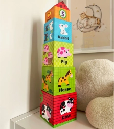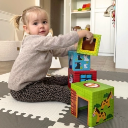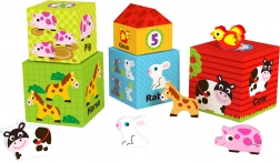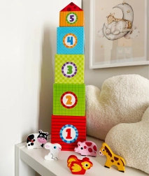 Genummerde kubussen met duidelijke illustraties leren het kind groottes onderscheiden, tellen en maken het spelenderwijs vertrouwd met de Engelse namen van dieren.