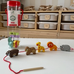 Het rijgen van houten diertjes aan het koord versterkt de vingertjes, verbetert de grip en traint precisie en concentratie.
