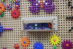 De inhoud van de bak zie je in één oogopslag – kinderen vinden snel de juiste pinnen of schroeven en werken soepel en met plezier op het STEM-bord.