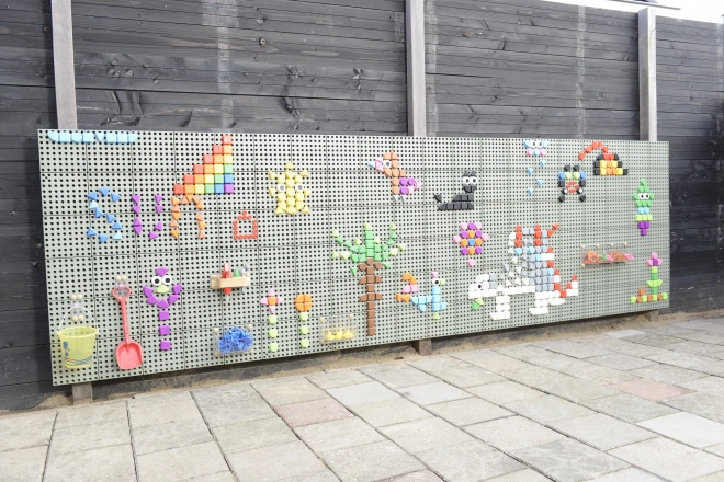 Het geperforeerde oppervlak maakt het mogelijk om kleurrijke afbeeldingen, letters en cijfers te leggen en zo de fantasie en fijne motoriek te ontwikkelen.