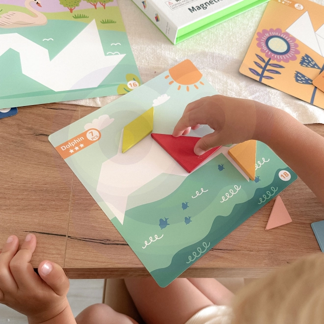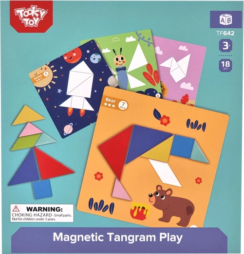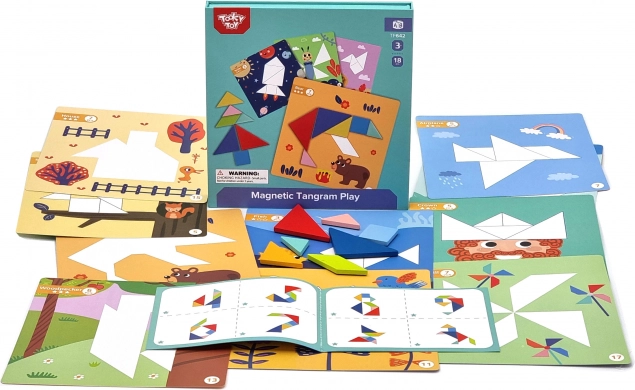 Met de magnetische tangram van TOOKY TOY leggen kinderen eenvoudig vormen en afbeeldingen op de meegeleverde ondergronden. De kleurrijke geometrische stukjes hechten aan de basis, waardoor ze thuis en onderweg prettig te hanteren zijn. Het spel stimuleert verbeeldingskracht, concentratie en zelfstandig oplossen van opdrachten.
