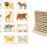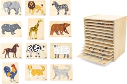De houten puzzelset met dieren van Viga is een educatief speelgoed dat elk kind enthousiast zal maken. Het bevat 12 houten platen met kleurrijke dieren van over de hele wereld, waarin het kind ze in contouren plaatst. Mooie kleuren en eenvoudige vormen zorgen voor een leuke en tegelijkertijd nuttige spelervaring.