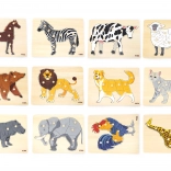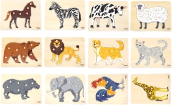 - 12 platen met afbeeldingen van dieren zoals kat, hond, paard, olifant en meer.